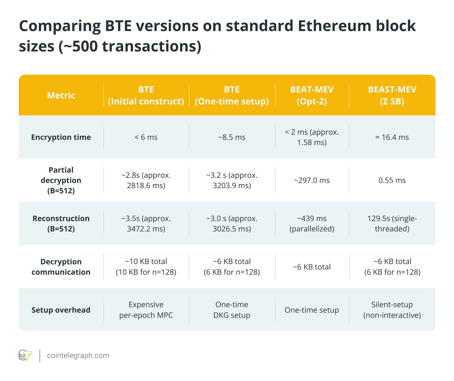 Однако последующее объединение всех частичных расшифровок все еще требовало значительных интерактивных вычислений. Чтобы решить эту проблему, BEAST-MEV заимствовала технику субпакетирования от BEAT-MEV и использовала параллельную обработку, чтобы система могла расшифровать крупные партии (до 512 транзакций) менее чем за секунду. В таблице ниже суммированы особенности каждого более нового дизайна BTE по сравнению с оригинальной схемой BTE.