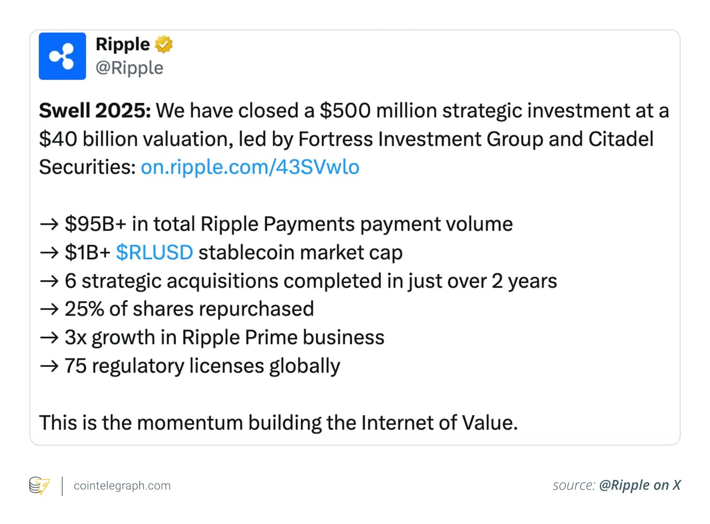 Ripple стремится сыграть большую роль в традиционных финансах. В интервью на Swell 2025 компания объяснила свою программу приобретений на сумму около $4 миллиардов как основу для перемещения институциональных средств через XRP Ledger наряду с существующими банковскими процессами.