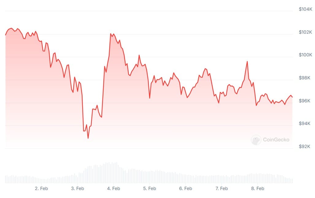 Биткоин упал ниже $93,000 и стал восстанавливаться только после того, как Трамп согласился отсрочить тарифы на Канаду и Мексику на 30 дней 3 февраля. Однако китайские тарифы вступили в силу как планировалось 4 февраля — и это был последний раз, когда биткоин торговался выше $100,000.