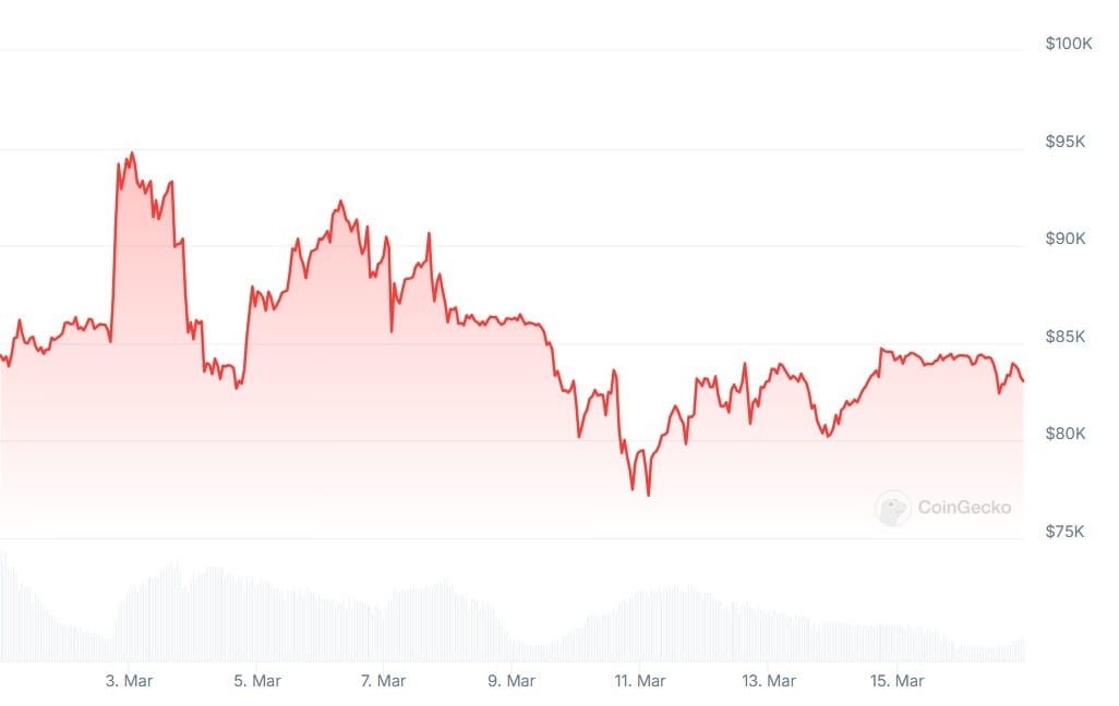 Биткоин торгуется на уровне около $84,000 1 и 16 марта, несмотря на большие колебания между этими датами. Источник: CoinGecko