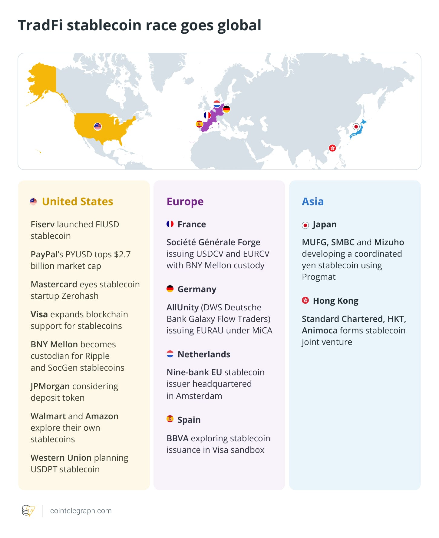 Традиционные финансовые институты в США, Европе и Азии теперь активно занимаются стейблкоинами, так как неопределенности в регулировании снижаются.