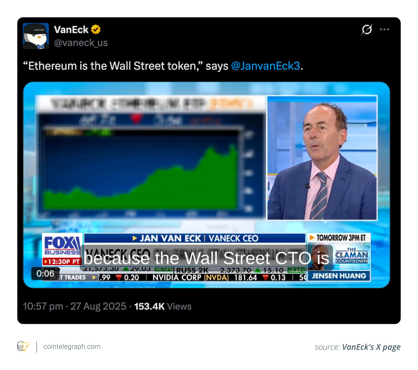 Для среднего наблюдателя Ethereum — это "монета" для торговли. Для Уолл-стрит же она стала чем-то гораздо более практичным: высокотехнологичной финансовой инфраструктурой. В августе 2025 года генеральный директор VanEck Ян ван Эк назвал Ethereum "токеном Уолл-стрит", подчеркнув, что сетевая архитектура стала мировым стандартом для расчетов между банками.