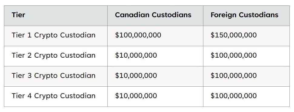 Также CIRO определила минимальные требования к капиталу для кастодианов — они масштабируются с учетом рисков и юрисдикции, а для иностранных компаний требования выше из-за сложности трансграничного принуждения и неопределенности в вопросах банкротства.