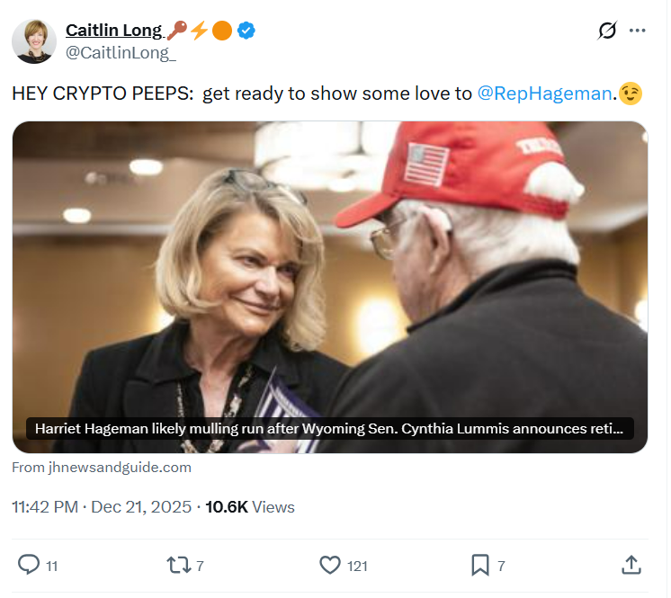 Криптовалютное сообщество Вайоминга уже подталкивает её в этом направлении. Кейтлин Лонг, основательница Custodia Bank и ключевое лицо в разработке законов штата, дружественных к блокчейну, похвалила Хагеман как "выходца из народа". Лонг отреагировала на новость о предполагаемом участии Хагеман в гонке.