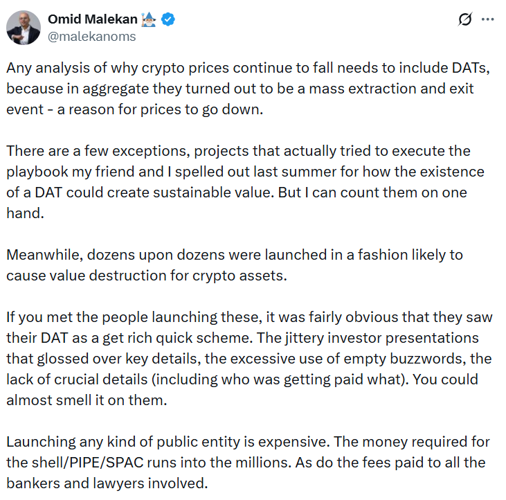 «Любой анализ причин падения криптоцен должен включать DAT [цифровые активы и резервы]», — сказал Малекан в посте на X во вторник. «В совокупности это оказалось массовым процессом изъятия и выхода — причиной снижения цен.»