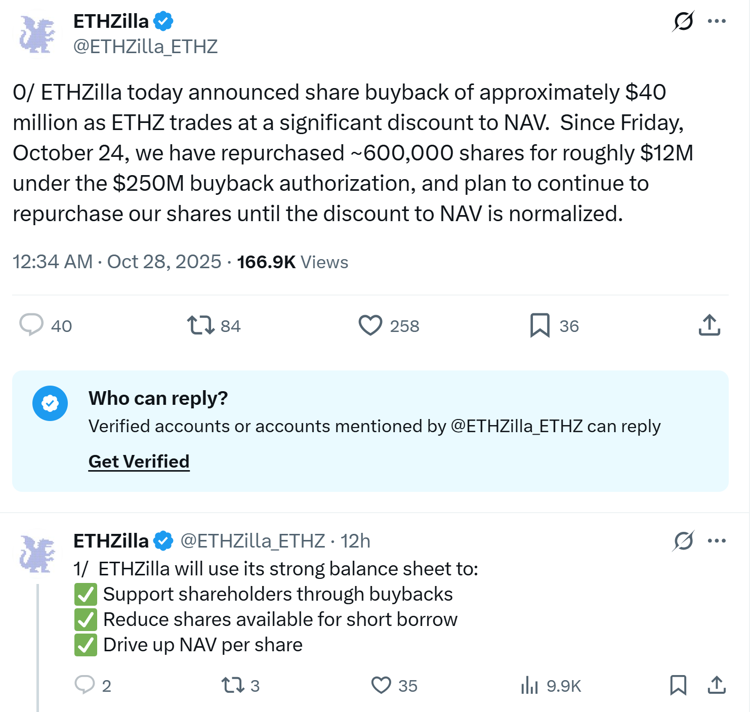 В понедельник ETHZilla также объявила о выкупе акций на сумму 40 миллионов долларов, так как ее акции продолжают торговаться с значительным дисконтом к NAV. Компания сообщила, что уже выкупила около 600,000 акций на сумму 12 миллионов долларов с 24 октября в рамках программы выкупа на 250 миллионов долларов.