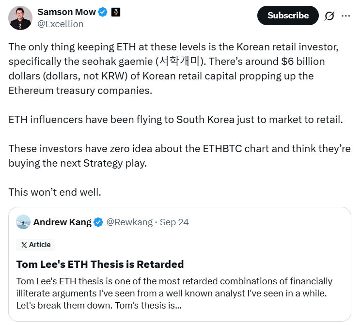 Около 6 миллиардов долларов от корейских розничных инвесторов удерживают цену Эфира (ETH) и корпоративные казначейства на текущих уровнях, утверждает Самсон Мо, генеральный директор компании Jan3, занимающейся технологиями Биткоина.
