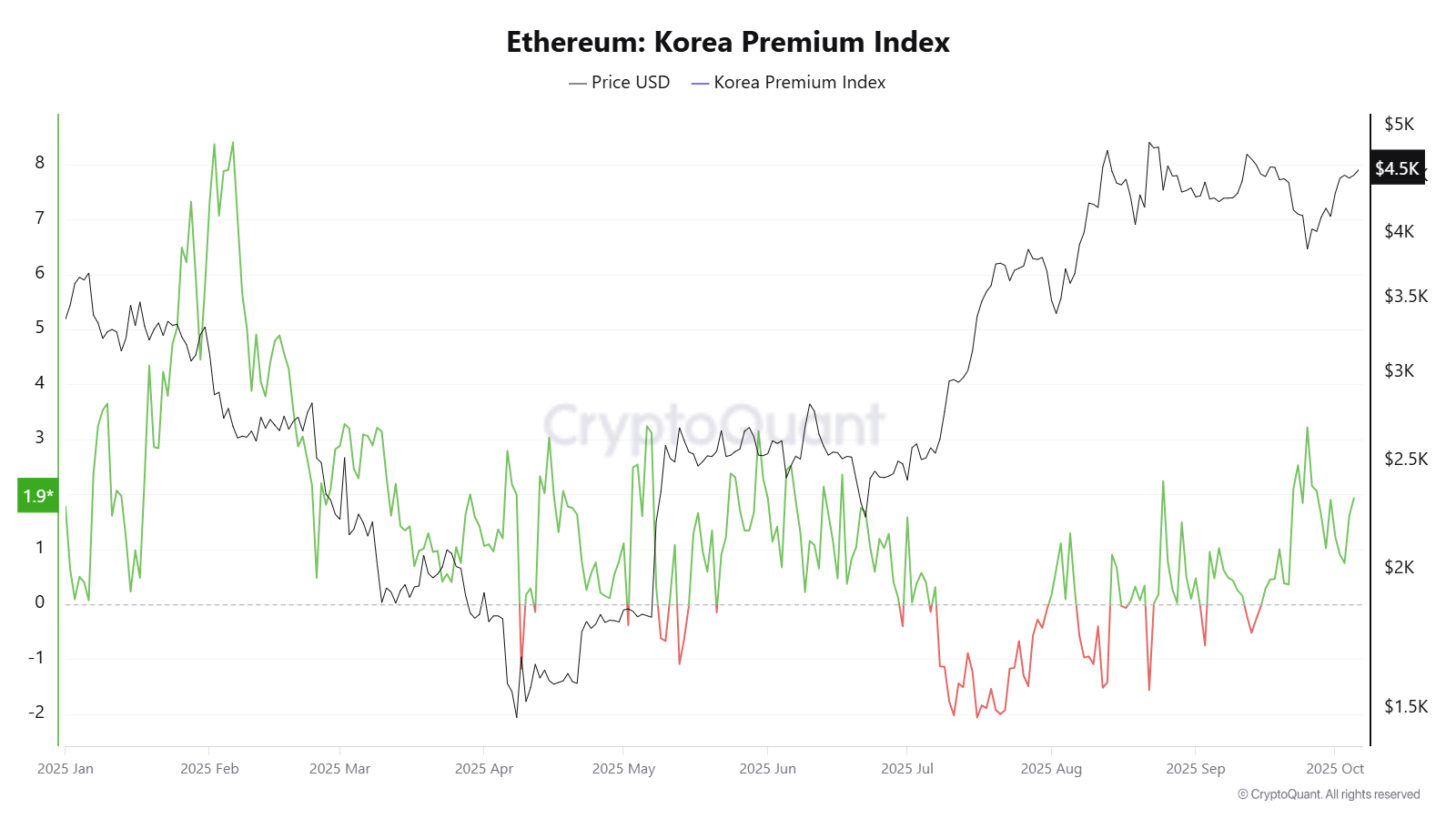Этот индикатор измеряет разницу в цене Эфира между южнокорейскими биржами и другими.