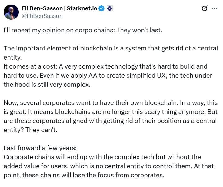Бен-Сассон заявил в понедельник в публикации на X, что он удваивает свою уверенность в том, что "корпо" цепочки не выдержат, так как они не соответствуют фундаментальной концепции блокчейна, которая требует избавиться от "позиции центральной организации".