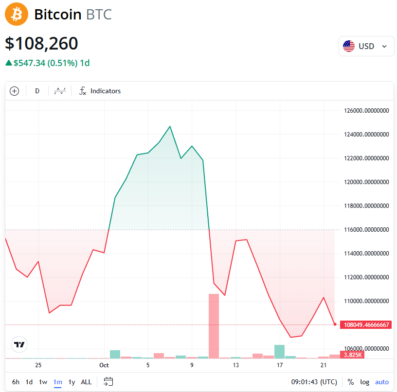 Биткоин упал на 6% за последний месяц и торговался на уровне около $108,260 на момент написания статьи, показывают данные.