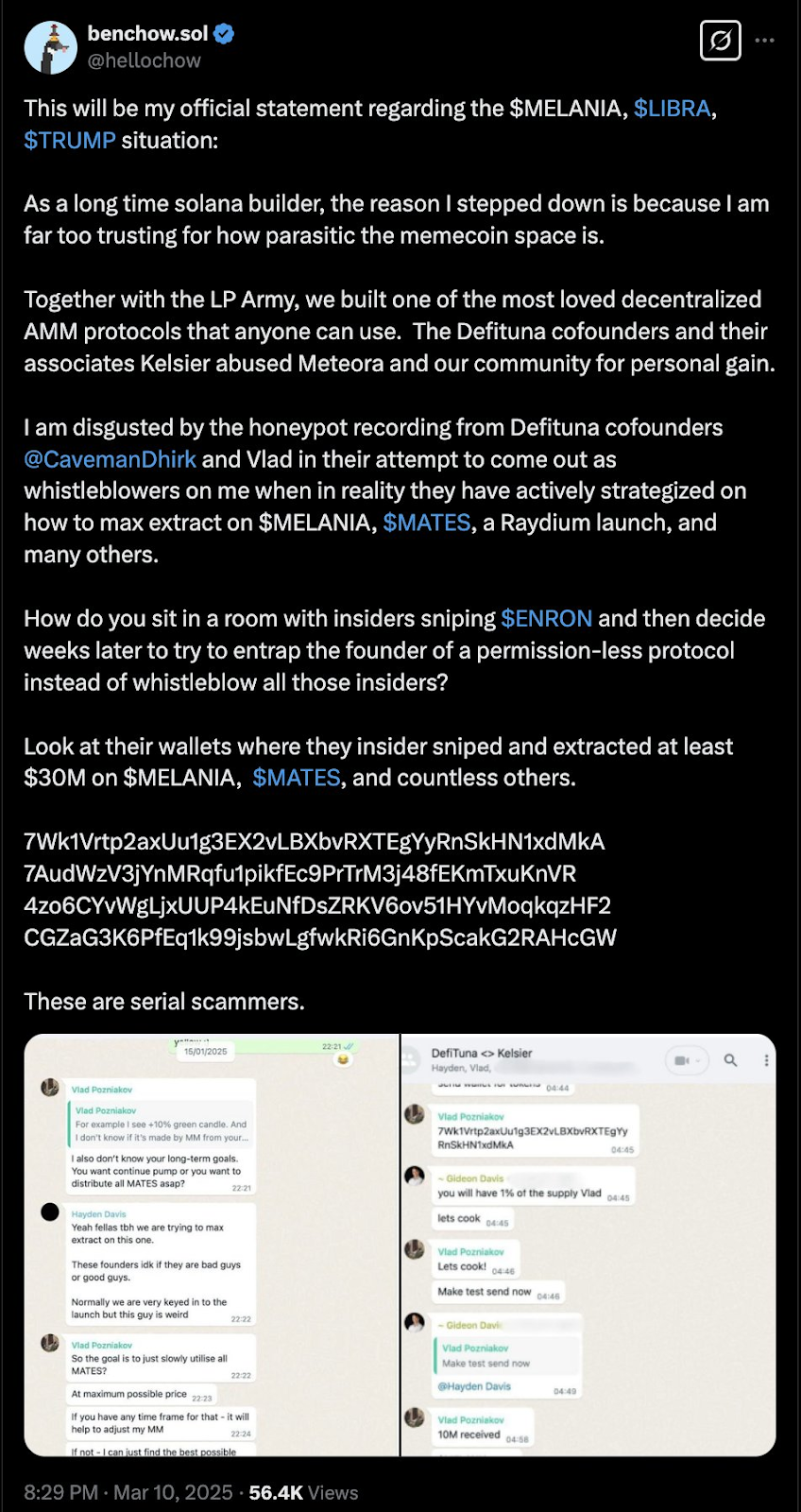 11 марта аккаунт Чоу в X разместил «официальное заявление» о его уходе из Meteora. В сообщении обвинялись основатели DefiTuna Влад Позняков и Дирк в том, что их единственная цель заключалась в извлечении максимальной прибыли из различных запусков мемкойнов, включая MELANIA, Mates (MATES) и запуск Raydium.