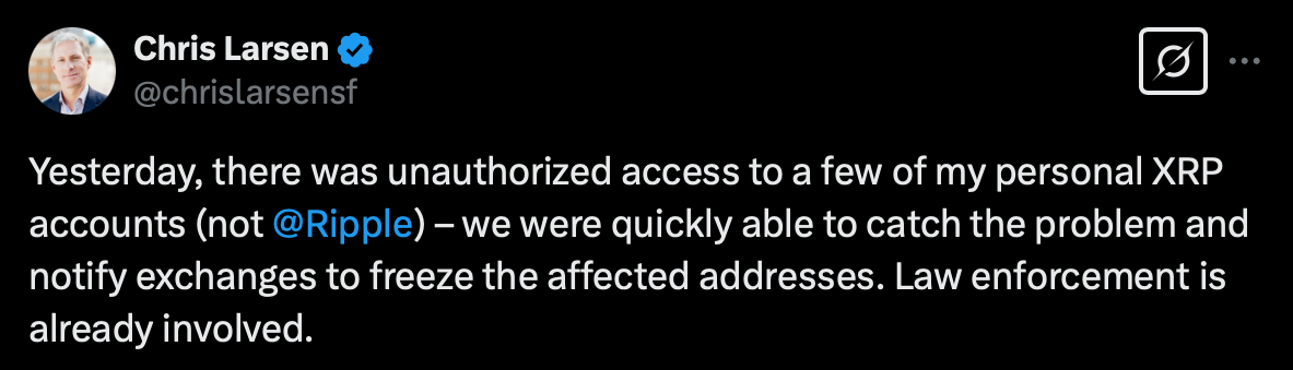 Кража в январе 2024 года 283 миллионов XRP из личных аккаунтов сооснователя Ripple Криса Ларсена была связана с утечкой данных из менеджера паролей, как сообщил криптоисследователь ZachXBT по материалам заявления о конфискации, поданного американскими правоохранительными органами.