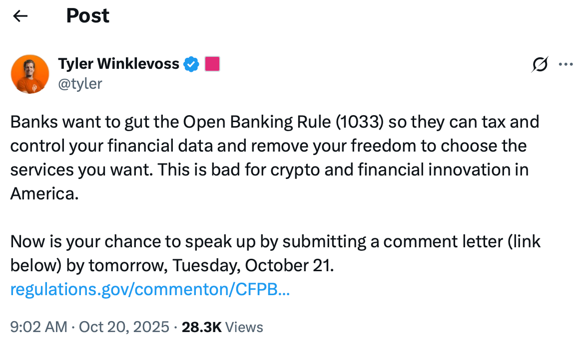 В понедельник соучредитель Gemini Тайлер Уинклвосс написал в X: «Банки хотят уничтожить правило об открытом банкинге (1033), чтобы они могли облагать налогами и контролировать ваши финансовые данные и лишать вас свободы выбора услуг. Это плохо для криптовалют и финансовых инноваций в Америке.»