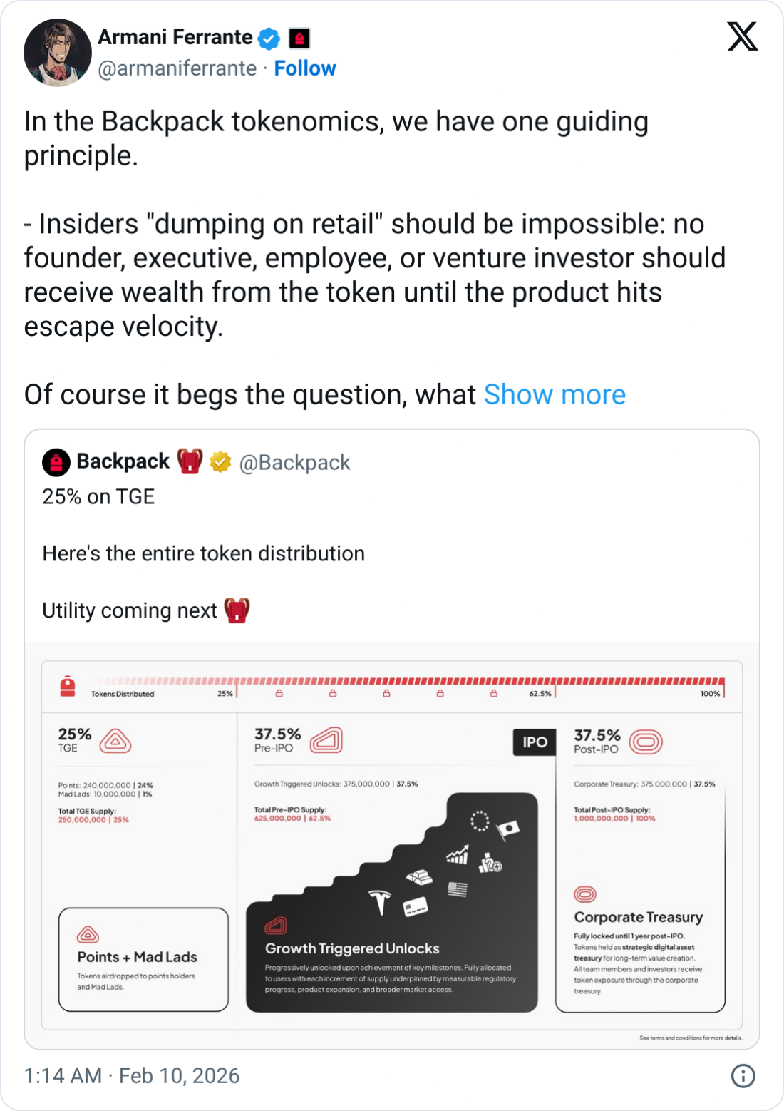 По словам Ferrante, ни команда Backpack, ни инвесторы не должны получать выгоду от токена «пока продукт не наберет критическую скорость», и он связывает это с проведением IPO.