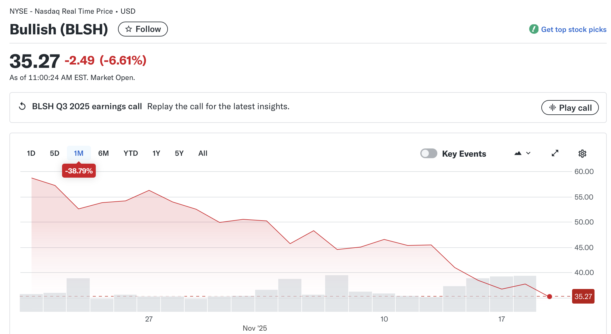 Цена акций Bullish не реагировала положительно на новости. Она снизилась более чем на 6% в ранние часы торгов и остается в минусе на почти 40% за последний месяц.