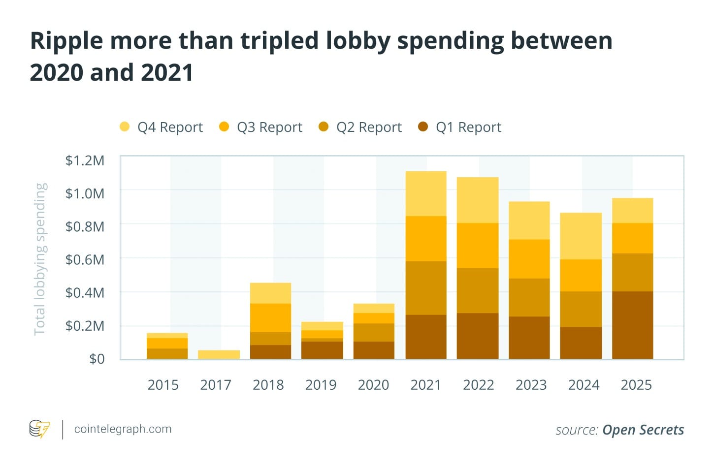 При этом участие криптокомпаний в политике началось раньше. В период роста рынка в 2020–2021 годах компании активно покупали рекламу, индустрию продвигали знаменитости, а имя FTX появилось на арене баскетбольной команды Miami Heat. Параллельно росло и лоббирование в Вашингтоне: Coinbase увеличила расходы на эти цели с $1,5 млн в 2020 году до $3,9 млн в 2021‑м, а Ripple — с $330 тыс. до более чем $1,1 млн.