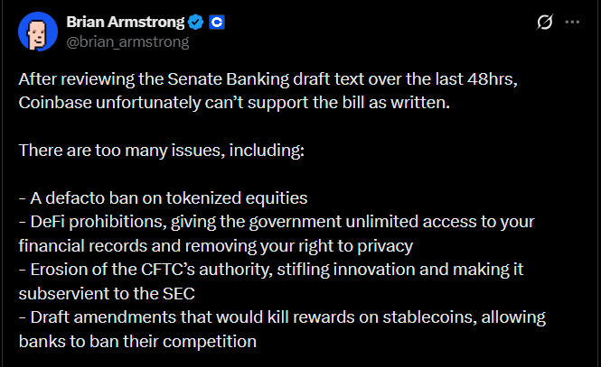 Острота влияния лобби проявилась и в судьбе законопроекта о структуре крипторынка в Сенате: работа застопорилась после того, как Coinbase отозвала поддержку. Гендиректор компании Брайан Армстронг писал об этом в X.