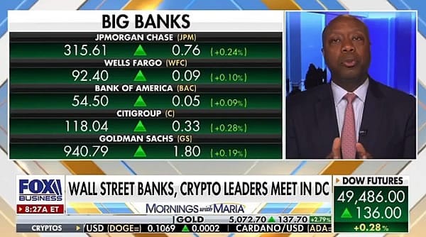 Председатель банковского комитета Сената Тим Скотт заявил Fox News в среду, что возможность для криптокомпаний выплачивать вознаграждения — это скорее плюс, однако они не должны рекламировать себя так, будто являются банками.