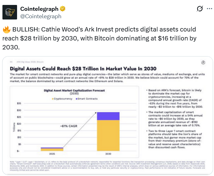 В отчете Big Ideas 2026 ARK оценила, что крипторынок способен расти со среднегодовым темпом 61% (CAGR) и достичь целевой отметки $28 трлн к 2030 году, при этом на биткоин может прийтись около 70% от этой суммы.