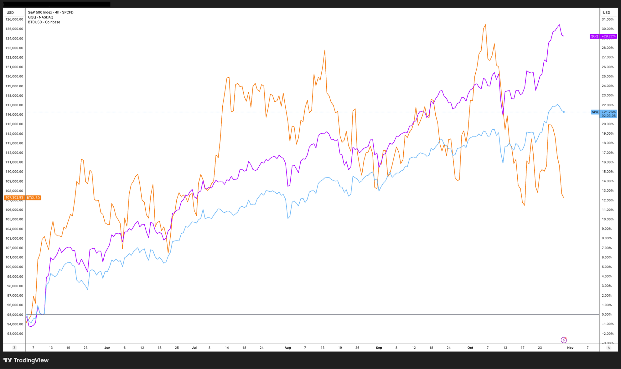 Месячное падение цены Биткоина (BTC) ускорилось, когда стоимость снизилась до $107,328 вскоре после открытия торгов в Нью-Йорке, достигнув внутридневного минимума в $106,800. Это движение отразило незначительную слабость на фондовых рынках США, где индексы S&P 500 и Nasdaq зафиксировали небольшие потери, несмотря на прогнозы, что доходы за третий квартал Больших Техно-компаний превзойдут ожидания.