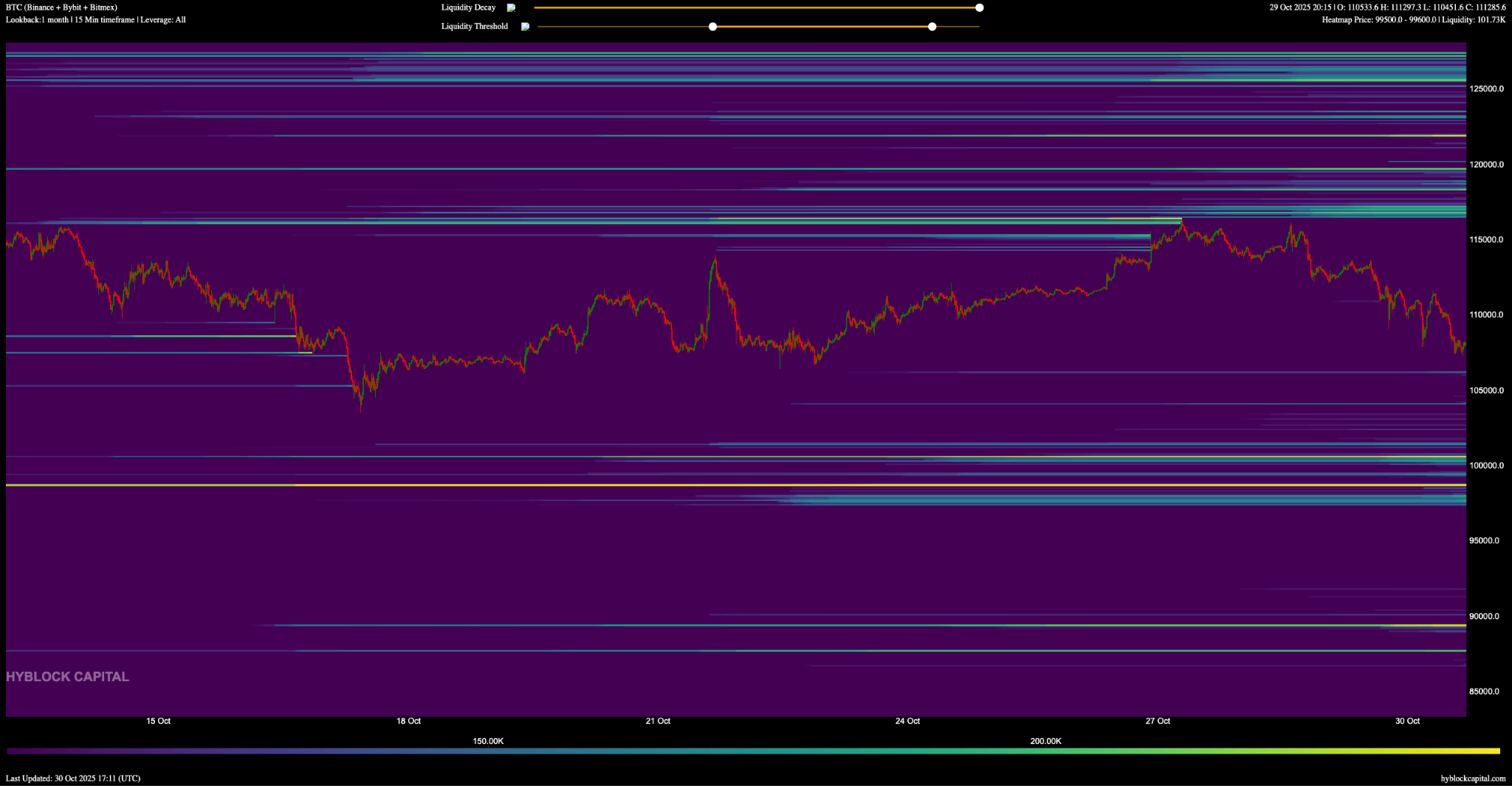Исторический взгляд на месяц, включающий более долгосрочные позиции, показывает длинную ликвидность на уровнях $100,500 и $98,600.
