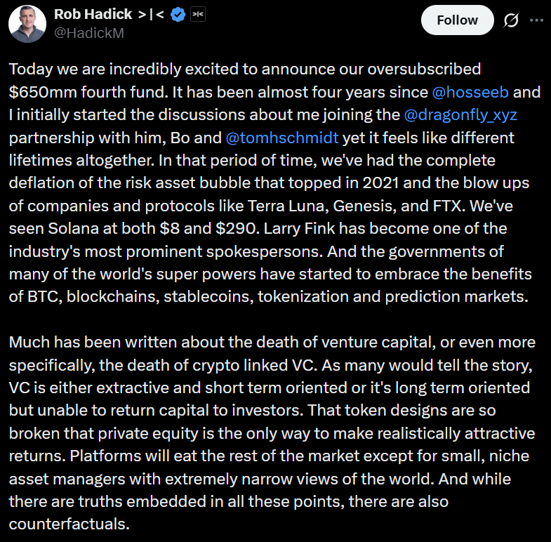 На фоне перестройки рынка венчурных инвестиций в криптоиндустрии Dragonfly Capital завершила формирование своего четвертого фонда объемом $650 млн, что указывает на сохраняющийся интерес институциональных инвесторов к блокчейн-инфраструктуре.