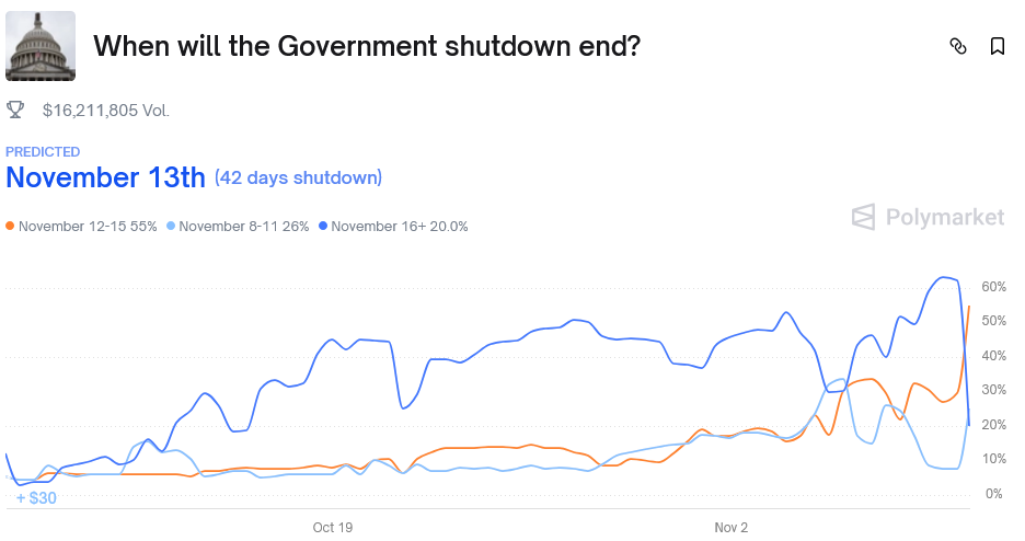 На рынке предсказаний Polymarket пользователи поддерживают завершение шатдауна в четверг, а рынок показывает 54% вероятность того, что это случится в период с вторника по пятницу.