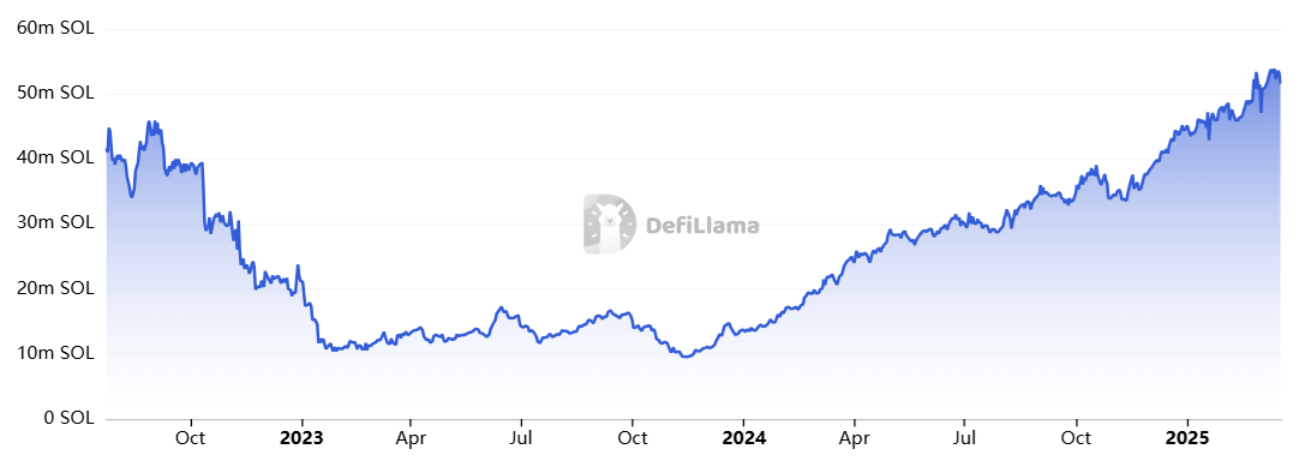 Общая стоимость заблокированных средств на Solana (TVL), SOL. Источник: DefiLlama