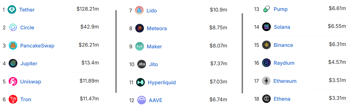 Платформа для запуска мемкоинов Solana Pump.fun, децентрализованная биржа Jupiter, автоматизированный маркетмейкер и поставщик ликвидности Meteora, а также станция для стейкинга Jito — среди лидеров по сборам. Примечательно, что еженедельные сборы основной сети Solana превысили сборы Ethereum, который удерживает первое место с $53,3 миллиарда в TVL.