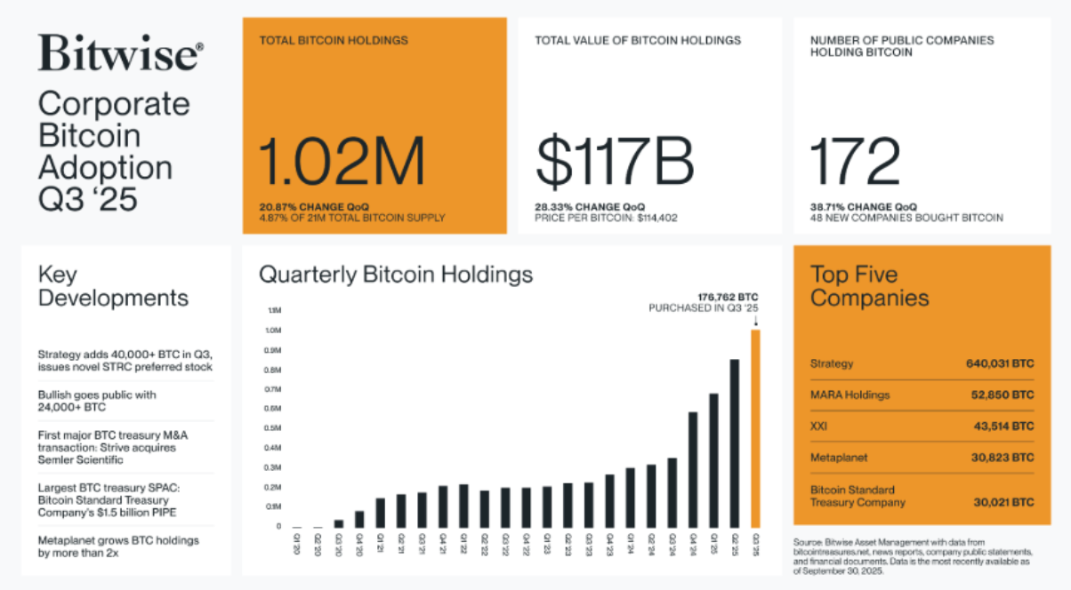В своем Отчете о корпоративном принятии биткойна за третий квартал, Bitwise обнаружила, что 172 компании теперь держат биткойны на своих балансах, из которых 48 появились в третьем квартале.