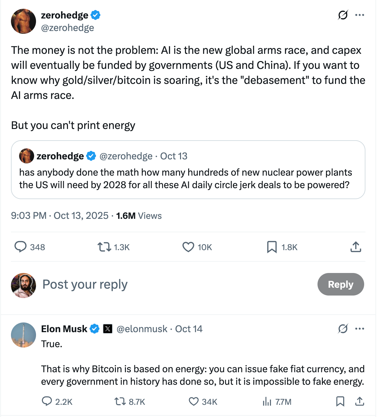 В посте на X Маск подчеркнул энергозатратную систему доказательства работы биткойна, описывая это как “невозможно подделать энергию” — в отличие, как он предположил, фиатных валют.