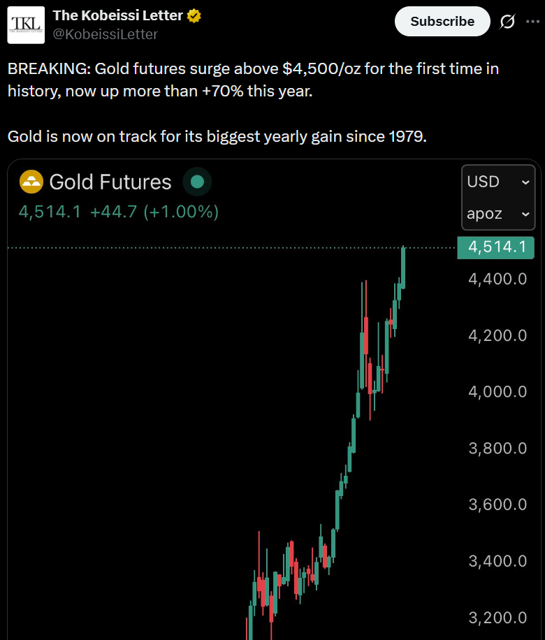 Цены на фьючерсы на золото недавно достигли новых исторических максимумов, превышая $4500 за тройскую унцию, продлевая годичное ралли, обусловленное покупками центральными банками, геополитическими рисками и ожиданиями снижения процентных ставок. По сравнению с этим, рынок Bitcoin и более широкий криптосектор демонстрируют более скромную динамику цен в тот же период.