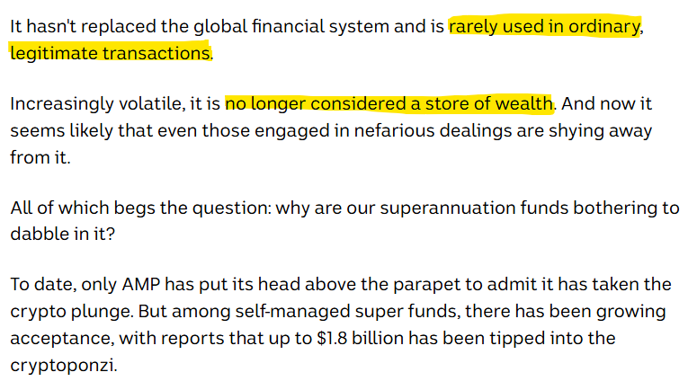 Другие утверждения в статье ABC заключаются в том, что биткоин никогда не достигал своих заявленных целей и не имеет практического применения; он редко используется в легальных транзакциях и больше не считается надежным средством сбережения.