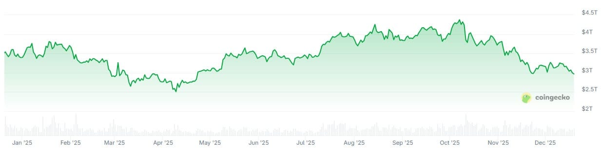 Однако криптовалютные рынки готовы закончить год ниже, чем они начали, с общим рыночным капиталом, упавшим более чем на 32% по сравнению с максимумом в $4,4 трлн в начале октября и почти на 13% с 1 января.