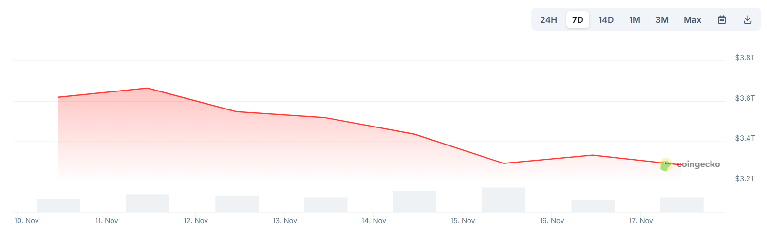Bitcoin кратковременно опустился до отметки $93,029 в воскресенье. Общая капитализация рынка также снизилась за последние семь дней, сократившись с $3,7 трлн 11 ноября до $3,2 трлн в понедельник, согласно данным CoinGecko.