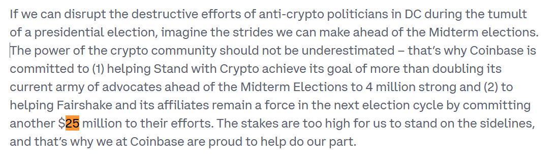 Coinbase выделяет $25 миллионов Fairshake. Источник: Coinbase