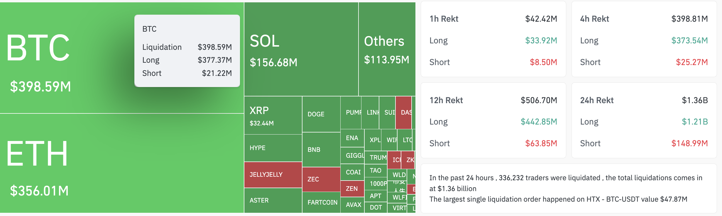 Более $1,21 млрд в длинных позициях было ликвидировано, из которых на биткоин приходилось $377 млн. Эфириум (ETH) следом ликвидировал $316,6 млн в длинных позициях.