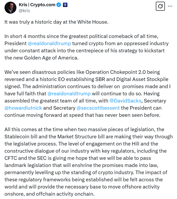 Президент США Дональд Трамп сделал криптовалюты центральной частью своей экономической стратегии, что стало значительным изменением в политике США в отношении блокчейн-индустрии, по словам генерального директора Crypto.com Криса Маршалека.