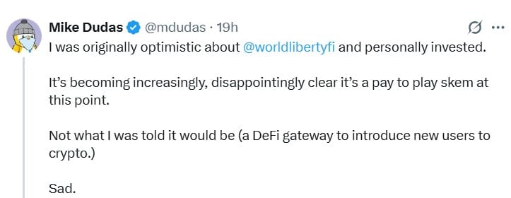 Майк Дудас, управляющий партнер фонда венчурных инвестиций 6MV и владелец WLFI, назвал проект «схемой продвижения».