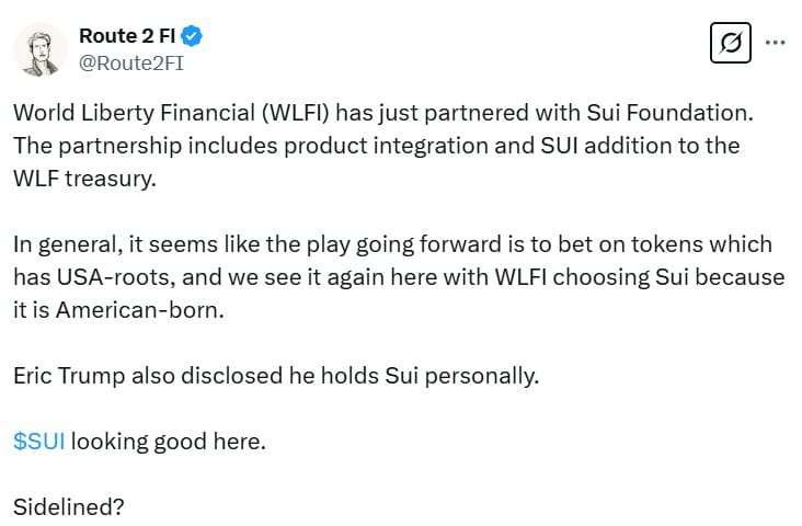 Включение Sui в резерв WLFI не является неожиданностью, так как Эрик Трамп, сын президента, открыто поддерживает и лично владеет криптовалютой.