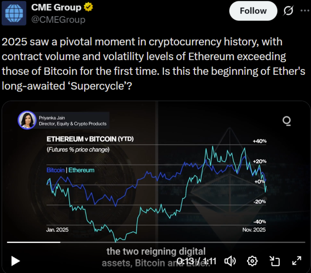 Компания CME Group сообщила о резком увеличении активности торгов фьючерсами на эфир, при этом объемы недавно превзошли объемы торгов опционами на Биткоин. Согласно заявлениям биржи, этот рост может свидетельствовать о догоняющей торговле или начальной стадии более широкого супер-цикла эфира.