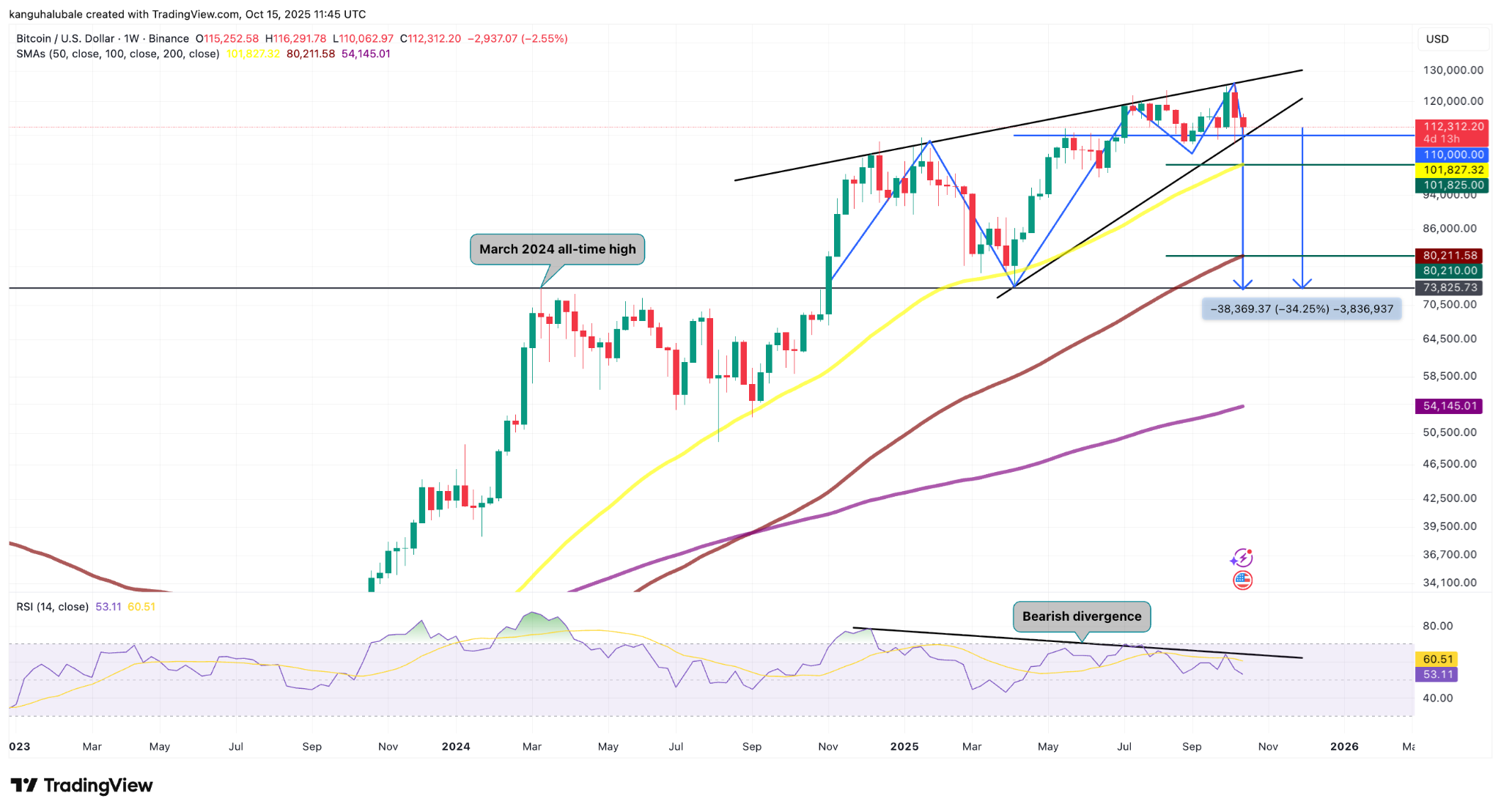 Как уже сообщалось ранее, несколько технических и ончейн метрик указывают на возможность падения пары BTC/USD до $74 000 в наихудшем сценарии, если цена не удержится выше уровня поддержки $110 000.