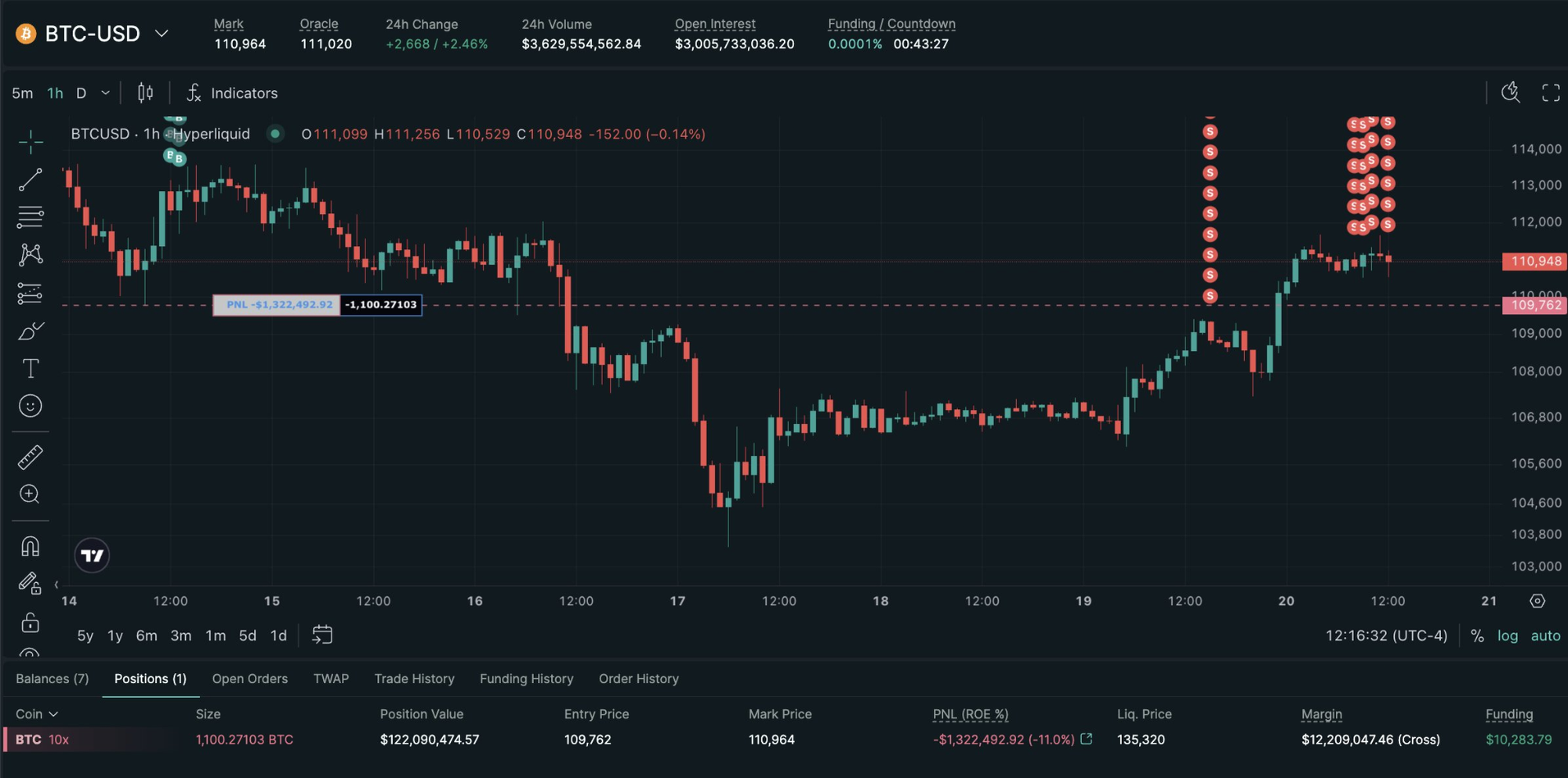 Крупный инвестор открыл шорт в понедельник, когда биткоин торговался на уровне 111 190 долларов. В настоящее время он несет нереализованный убыток в размере 2.6 миллиона долларов по своей ставке, который будет ликвидирован, если цена биткоина превысит 112 368 долларов, согласно данным блокчейна от Hypurrscan.
