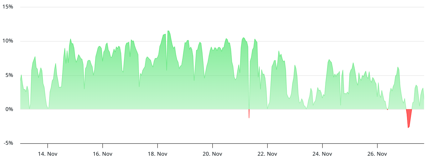 Спрос на кредитное плечо в бычьих позициях по ETH практически отсутствует с понедельника, как свидетельствует ставка финансирования бессрочных фьючерсов. В нормальных условиях эта ставка должна быть в диапазоне от 6% до 12% для компенсации капитальных затрат. Однако значительная часть текущей осторожности связана с неопределенностью после октябрьского краха.