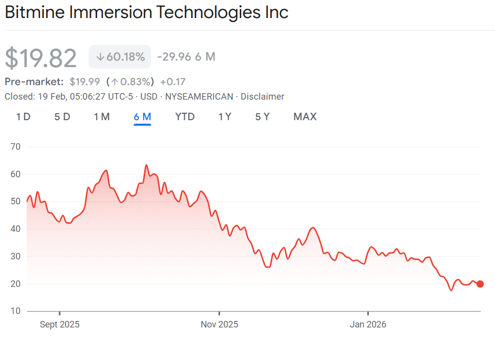 Накопление происходило на фоне сильного снижения цены акций BitMine: в четвертом квартале 2025 года BMNR просели примерно на 48%, а за последние шесть месяцев — примерно на 60%. На премаркете в четверг бумаги торговались около $19,90, по данным Google Finance.