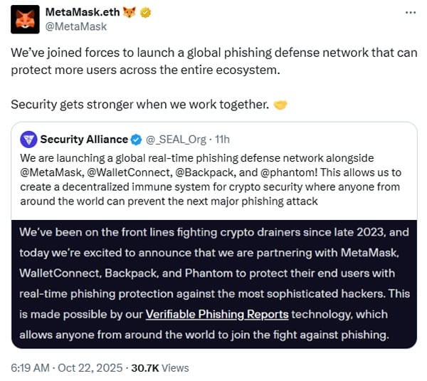 MetaMask, Phantom и другие крупные криптокошельки объединились с Альянсом безопасности для запуска глобальной сети защиты от фишинга, поскольку мошенники украли более 400 миллионов долларов в первой половине 2025 года.