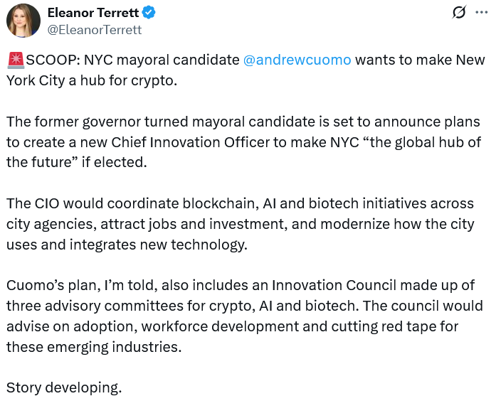 Сообщается, что бывший губернатор Нью-Йорка Эндрю Куомо серьезно рассматривает криптовалюту и искусственный интеллект в рамках своей кампании на пост мэра города.