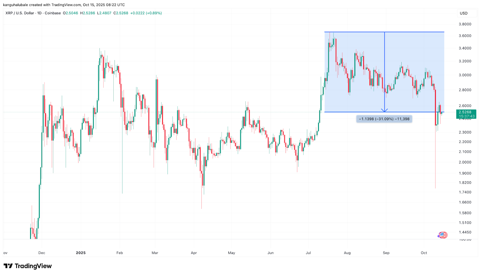 XRP (XRP) упал более чем на 31% после того, как достиг пика около $3,66 в июле, включая снижение на 12,5% за последние семь дней, что приблизило его к отметке $2,50.