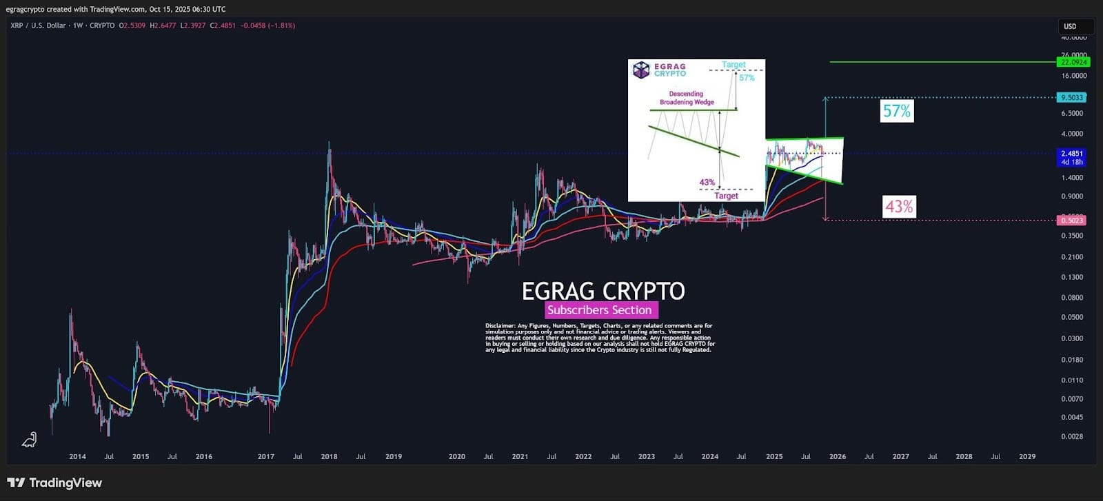 Он поделился графиком, показывающим, что курс XRP торгуется в рамках "расширяющегося нисходящего клина", у которого есть 57% шанс на прорыв вверх.