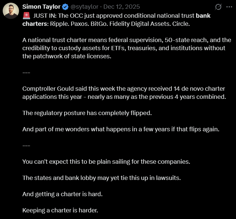 В Financial Times отмечают, что получение лицензии OCC проходит в два этапа: сначала предварительное одобрение, затем финальное — после подтверждения достаточного капитала и операционной готовности. Весь процесс может занять до года.